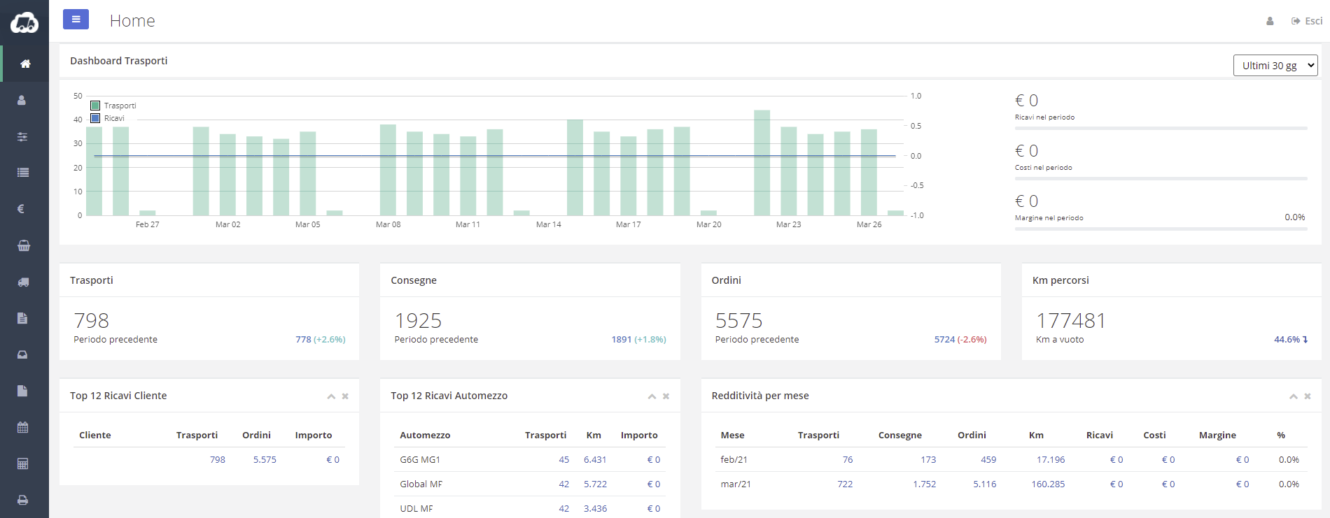 Puoi analizzare trasporti, consegne, ordini, fatturati cliente ed automezzo per mese, anno e periodi a scelta.