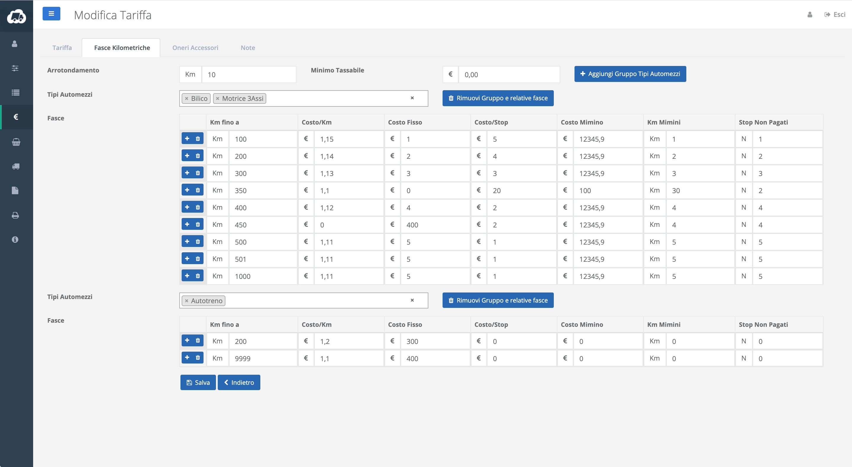 Con l’apposito applicativo “Calcolo Costo Industriale” è possibile calcolare i costi a km (oppure il costo orario) di ogni singolo automezzo di proprietà. Nel caso di impiego di vettori terzi è sufficiente inserire il listino fornitore, in qualunque modalità concordata (a km, a pallet, a quintale, a scaglioni o a forfait)